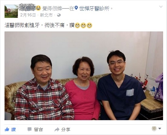 王媽媽: 温醫師微創植牙,術後不痛,讚!